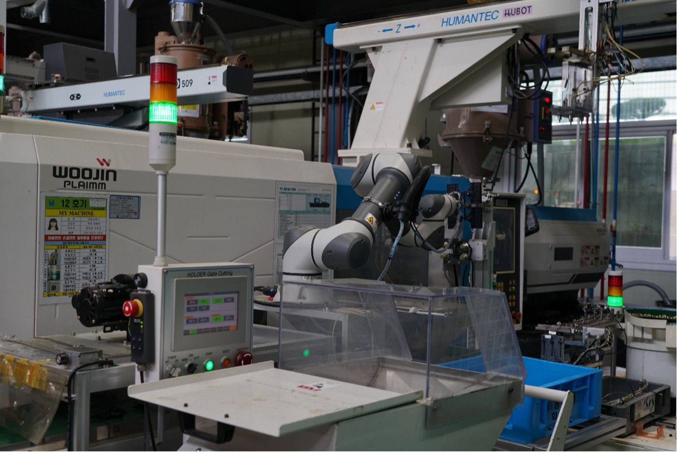 협동로봇 도입 이전에는 작업자가 끊임없이 나오는 생산품을 검수하고 분리하는 과정을 수작업으로 진행하다 보니 작업량에 과부하가 걸리거나 불량품이 인입되는 실수가 발생했었습니다. 이를 해소하고자 협동로봇을 도입한 이후에는 1명의 관리자가 여러 대의 기계를 관리하는 형태는 동일하지만 완성된 부품을 정리해 이동시키거나 재활용을 위해 스프루 러너를 파쇄기에 넣는 동작만 반복하기 때문에 작업량이 개선되었습니다. 이를 통해 작업 효율성이 크게 개선되었을 뿐만 아니라 24시간 제조라인을 멈추지 않고 운용할 수 있어서 제조 생산성이130%로 크게 증가하였습니다.