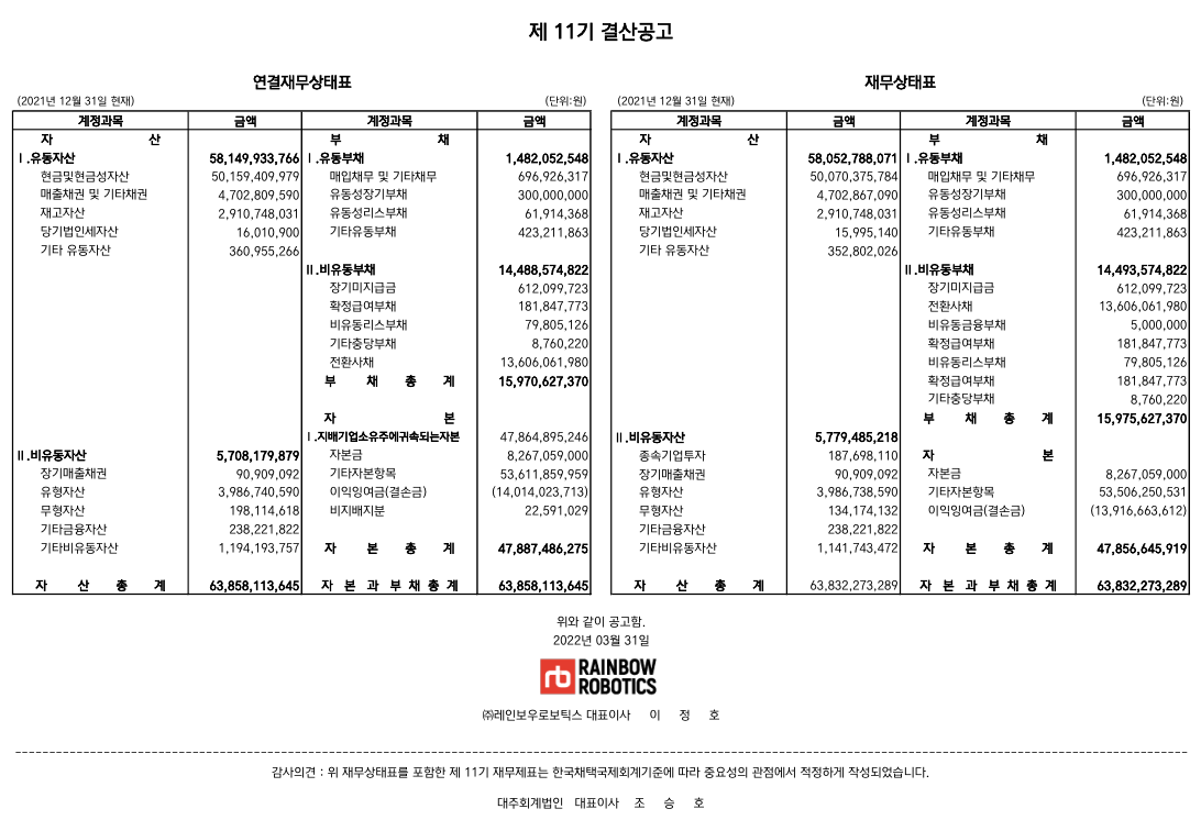 상법 제 449조에 의거 당사의 제11기(2021.01.01~2021.12.31) 결산 재무상태표를 아래와 같이 공고합니다.